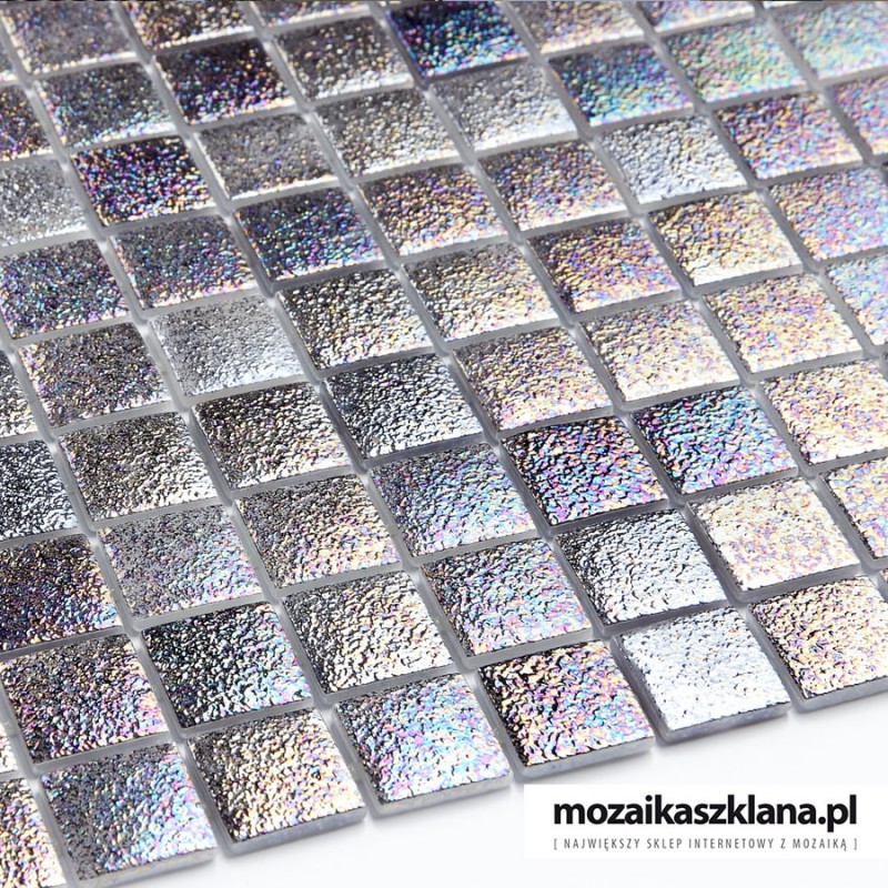 Ciemnoszara mozaika z opalizującym efektem i delikatną teksturą. Mozaika basenowa mieni się odcieniami srebra, fioletu, niebieskiego i złotego.
